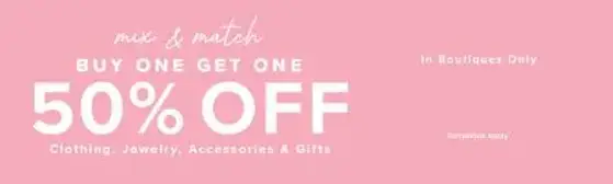 Shop in store and enjoy buy one, get one 50% off clothing, jewelry, accessories & gifts.