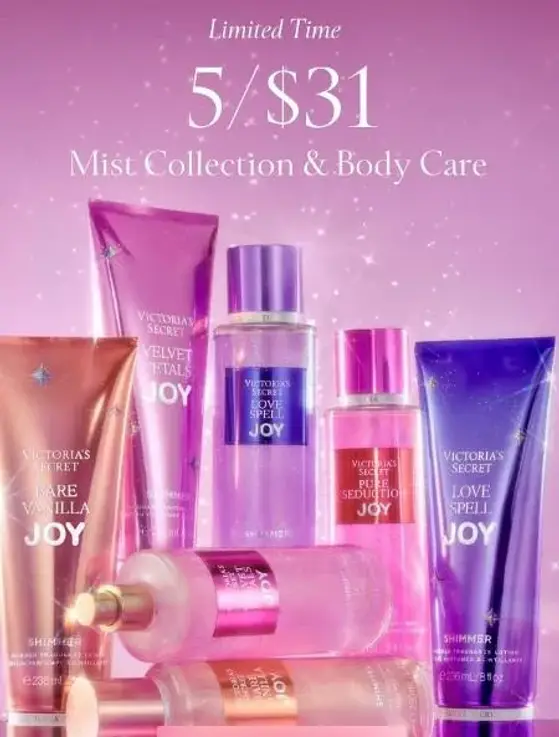 Limited-time savings! Shop in store and get 5 for $31 Mist Collection & Body Care.